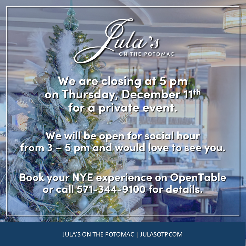 Best known for its spectacular panoramic views, Jula’s on the Potomac is one of the most sought-after dining spots in Metro DC.